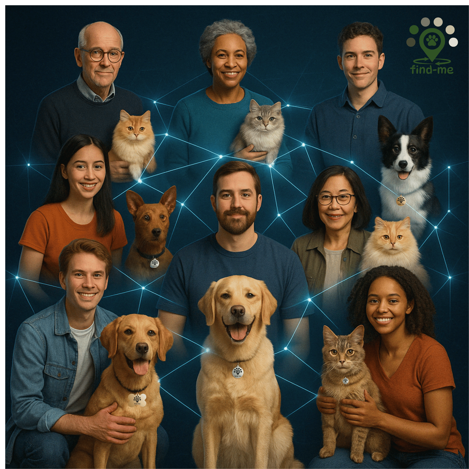Our app gives every pet a safety net. Whether they wear a Find-Me tag or not, you can register them and get help fast if they go missing — completely free.