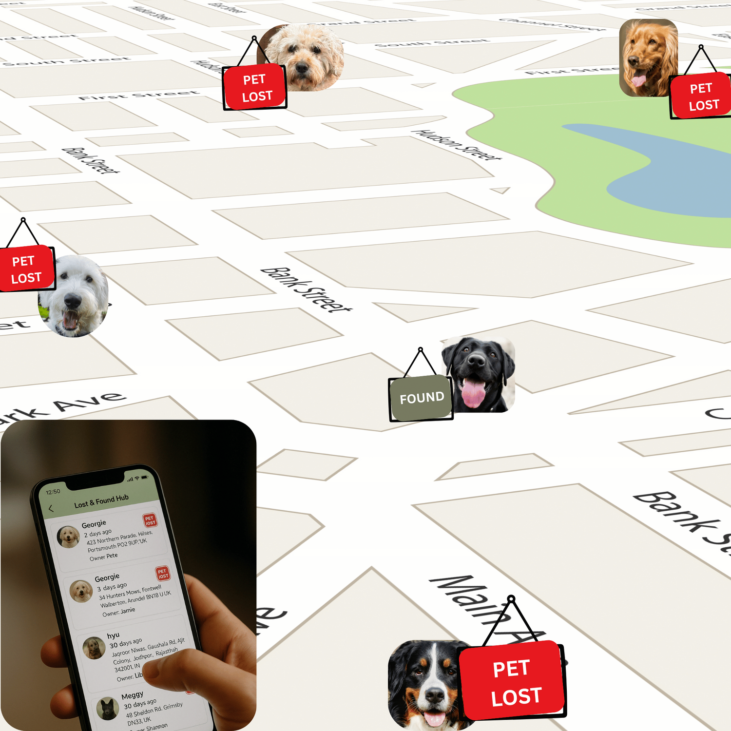 Our Lost Pet Hub lets users check which pets have been reported missing nearby — perfect for dog walkers, commuters, and everyday helpers.